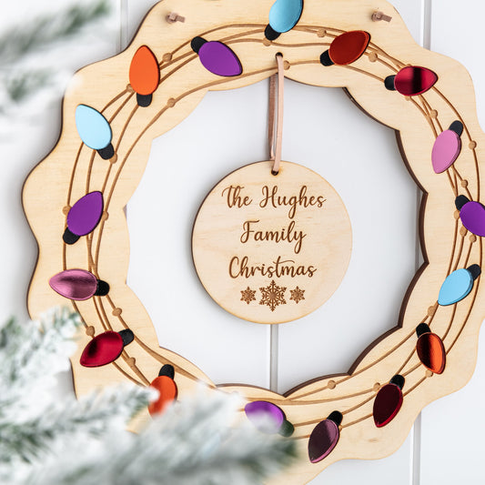 Personalised Wooden Christmas Wreath - Fairy Light Design