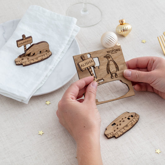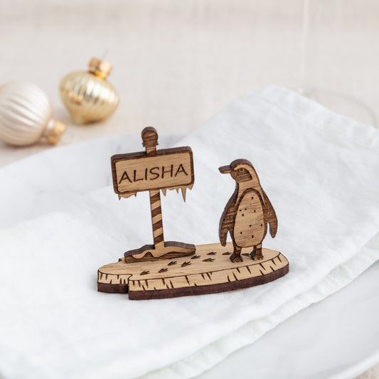 Stand Up Wooden Personalised Christmas Table Place Settings - Penguin