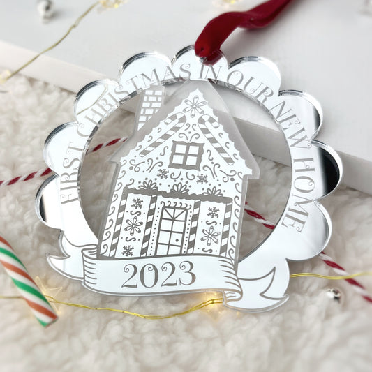 Gingerbread House 'First Christmas In Our New Home' Tree Decoration - Silver Mirrored