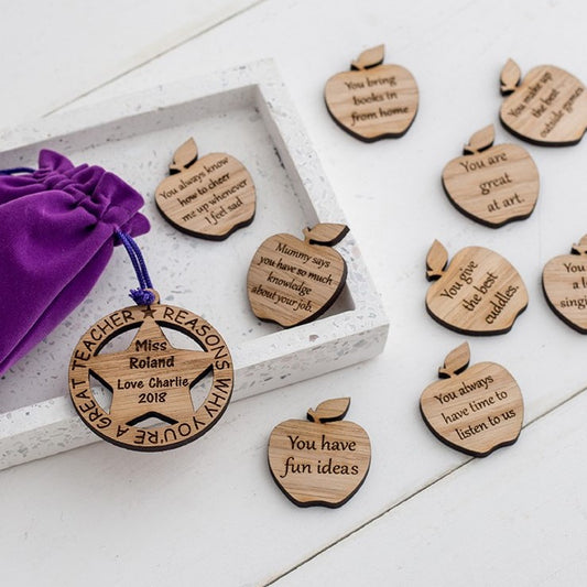 10 Wooden Personalised Apples with Customized Tag in Velvet Bag
