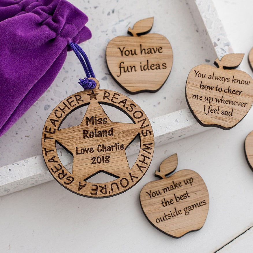Packaged within a velvet pouch, 10 wooden apples are engraved with your own wording - a thank you gift to teachers who are making an impact on your little ones education.
