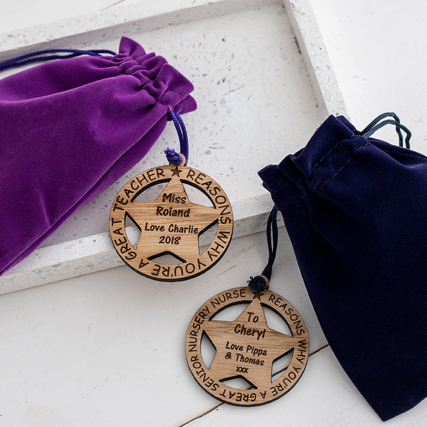 The main wooden tag attached to the bag can be personalised around the edge with the title role of the recipient: 'REASONS WHY YOU'RE A GREAT......', Ideal for Nursery teachers, TA's, Support workers, Dinner Lady's, Headteachers and a favourite teacher.