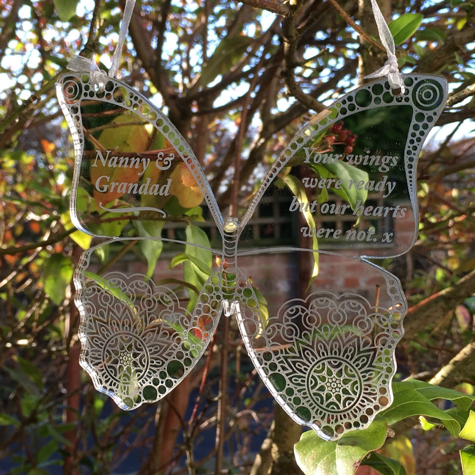 A meaningful decoration to remember loved ones which are sadly no longer with us. Made from silver mirrored acrylic, this butterfly is suitable to be displayed outside within the garden as a hanging decoration.