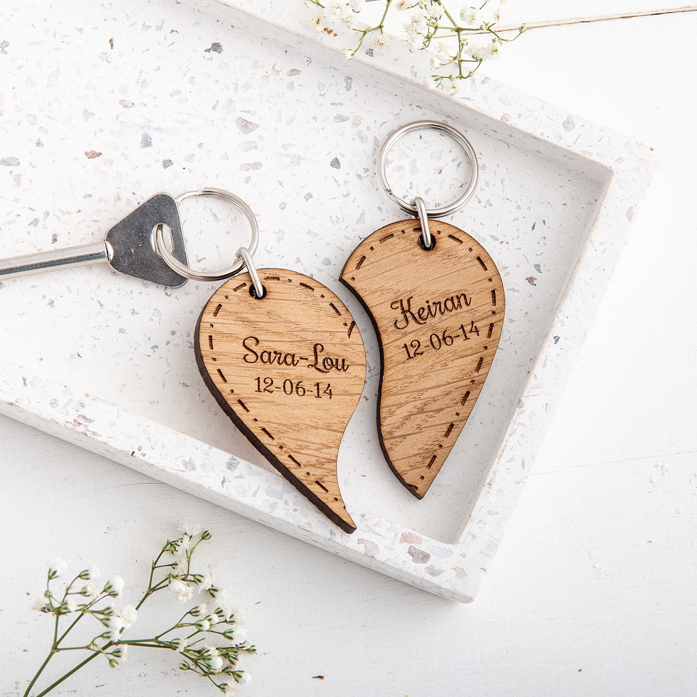 A pair of keyrings; 2 halves of a heart, when put together they complete each other. This romantic set of key-chains are personalised with a name and a date on each half, the perfect way to keep your loved one close by, always.