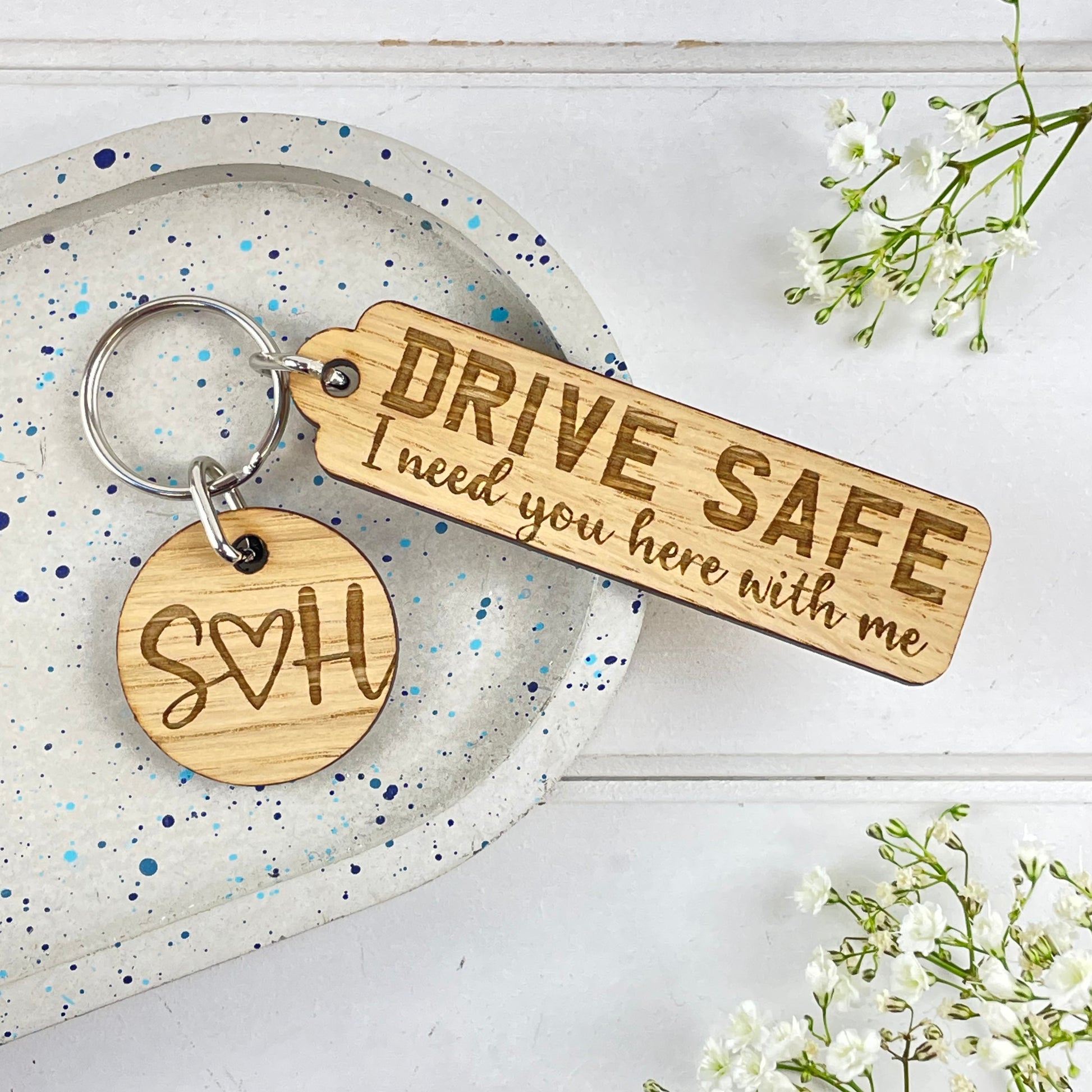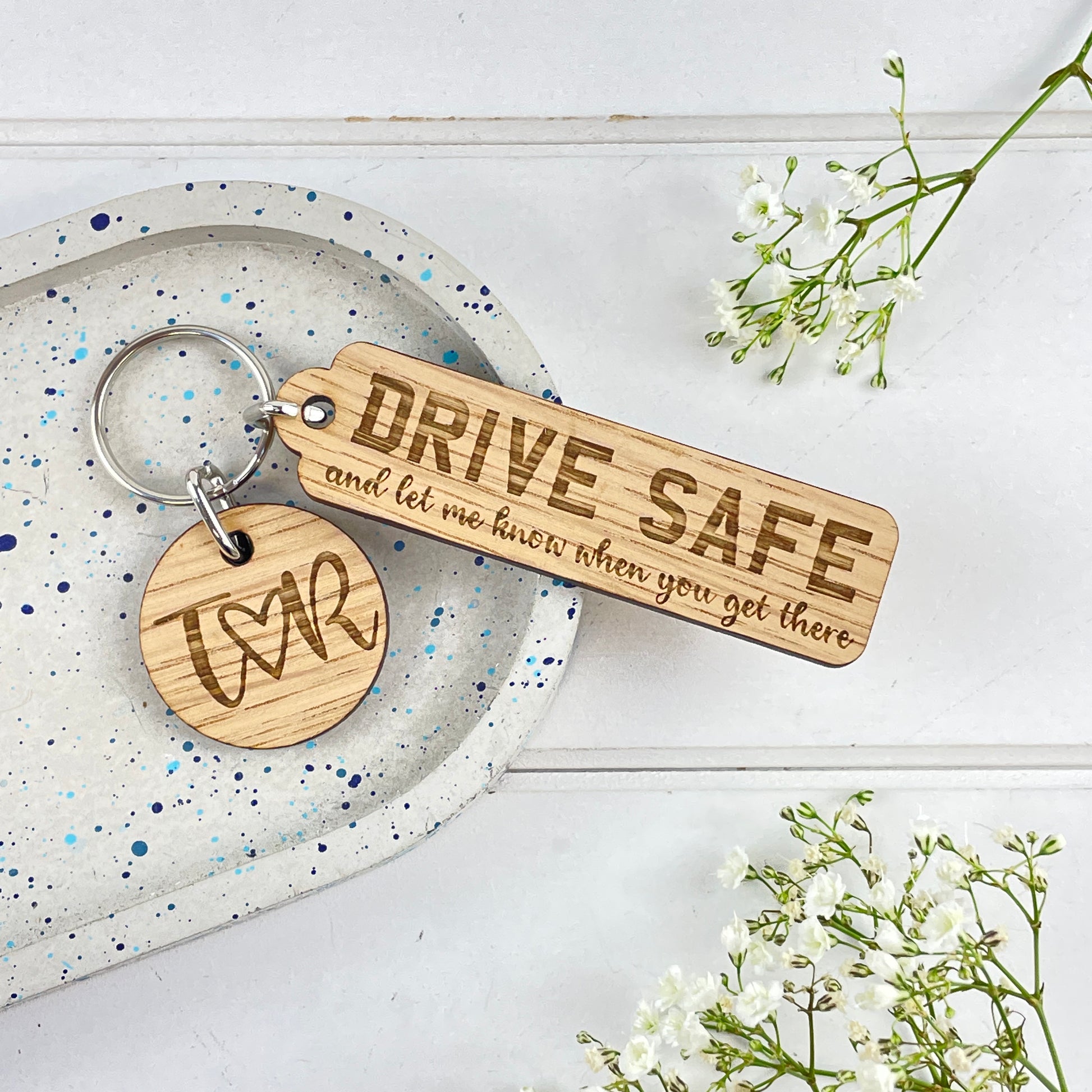 Wooden drivers keyring engraved with 'Drive Safe' and a choice of wording. This wooden laser engraved keyring is also available with a personalised wooden charm.