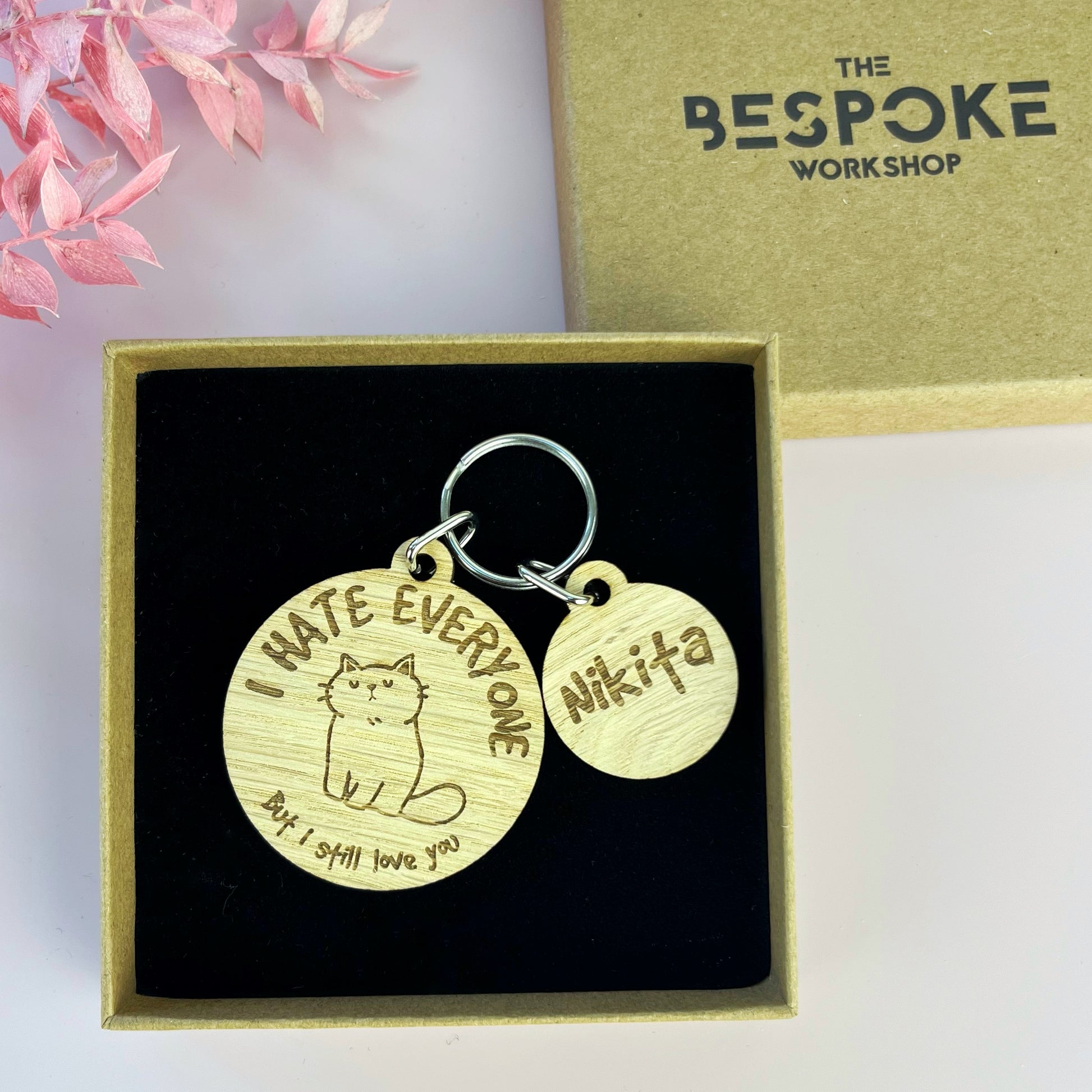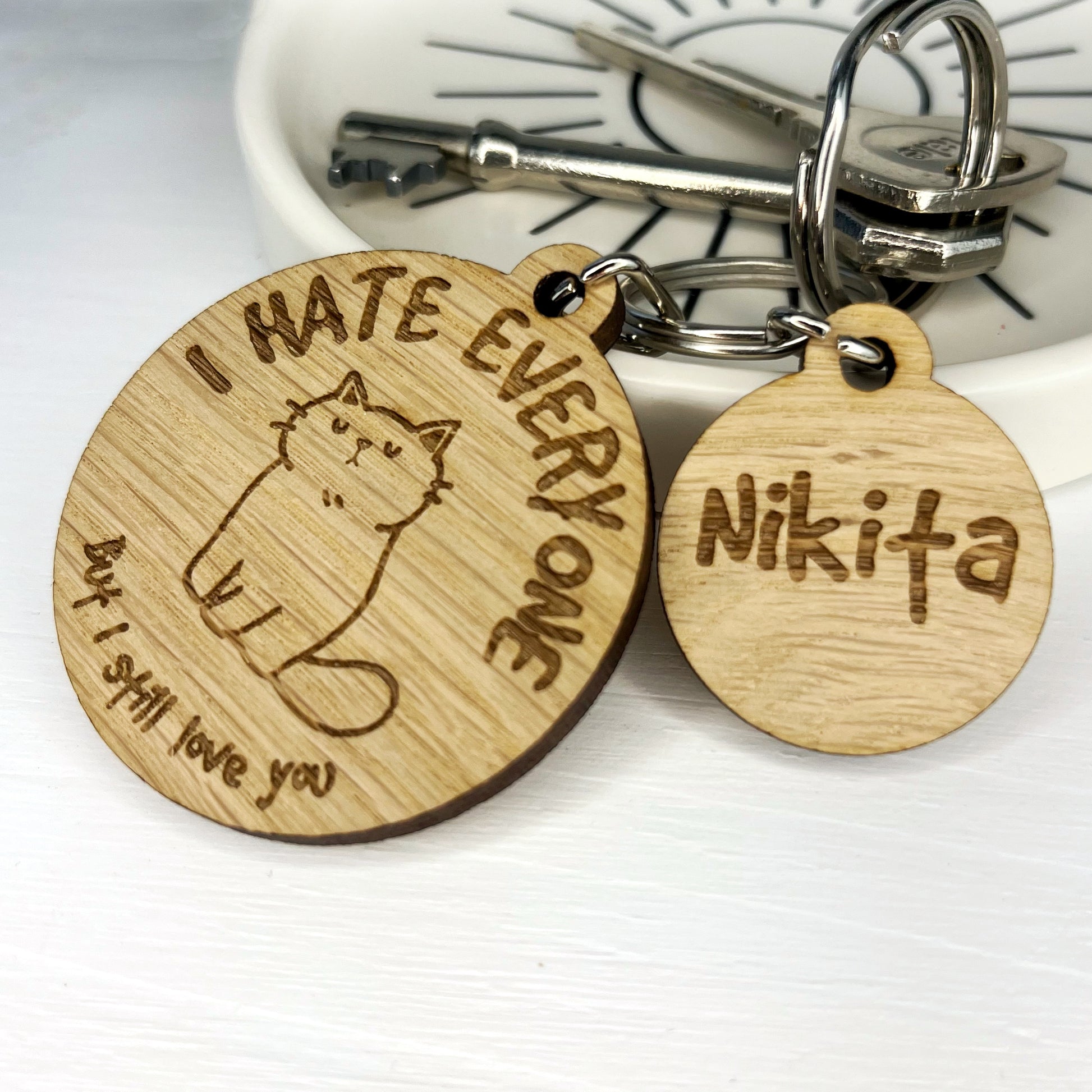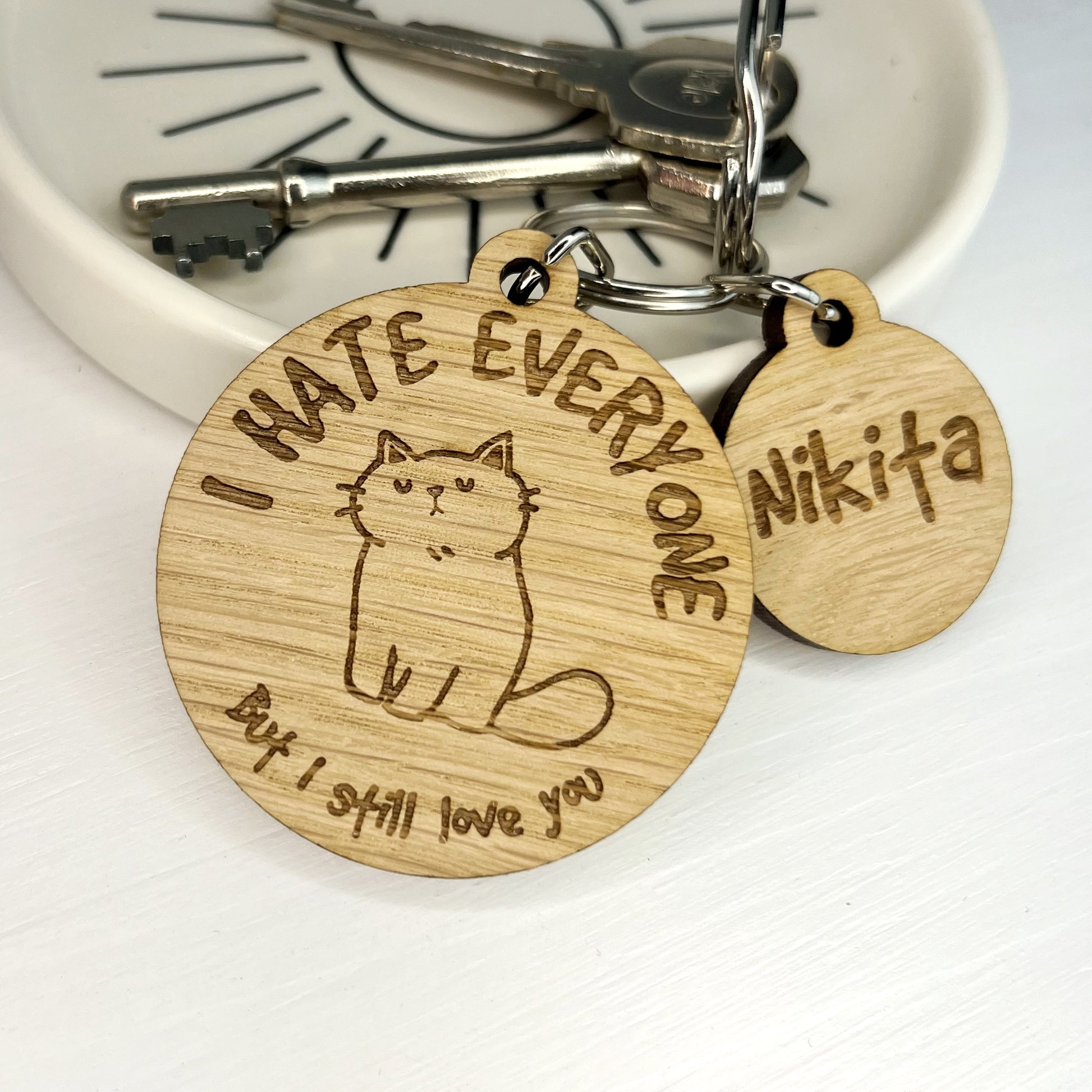 This wooden 'cute' hateful cat keyring is engraved with the wording 'I hate everyone, But I still love you'. Attached to this plastic free keyring is a small simple charm engraved with enough space to engrave up to two names.