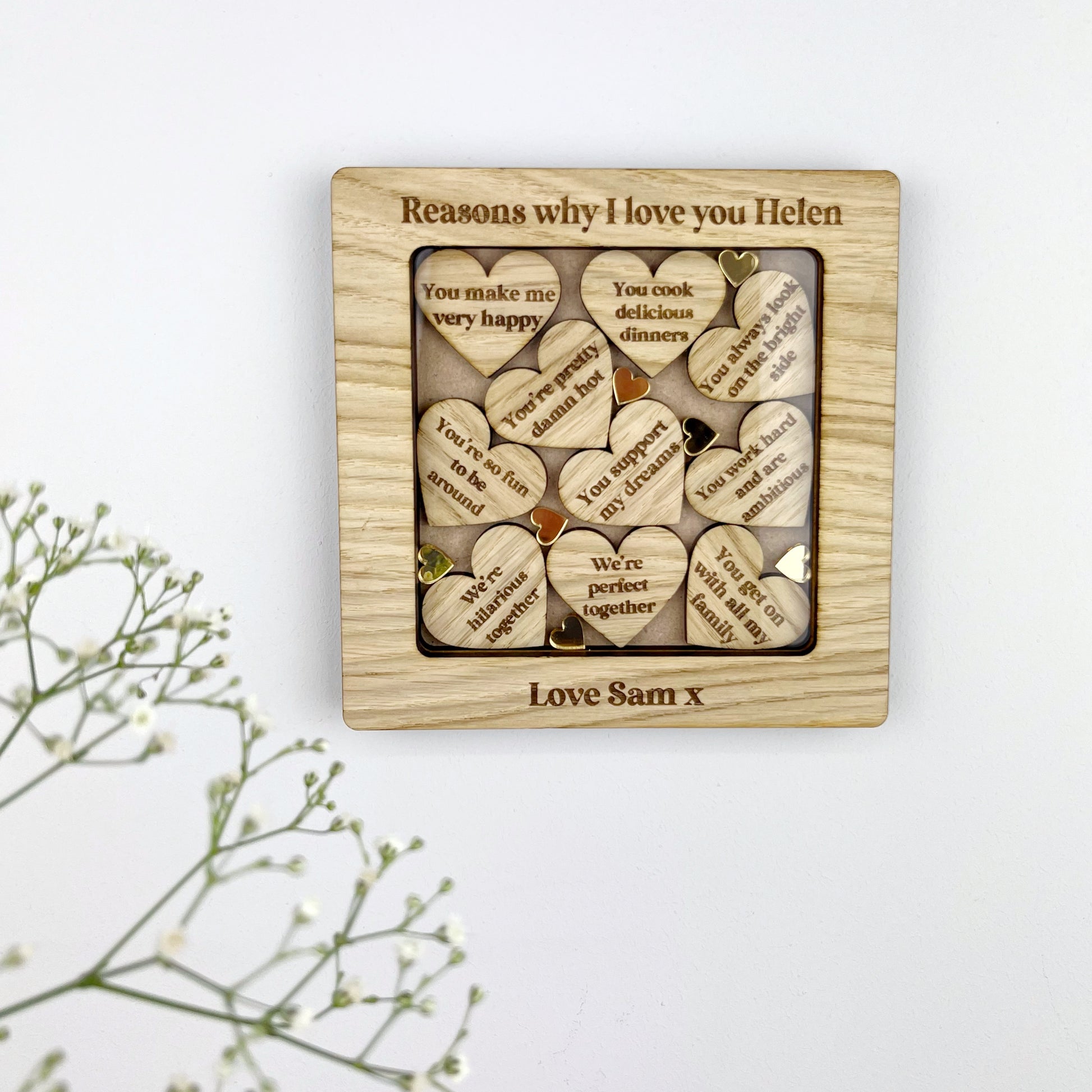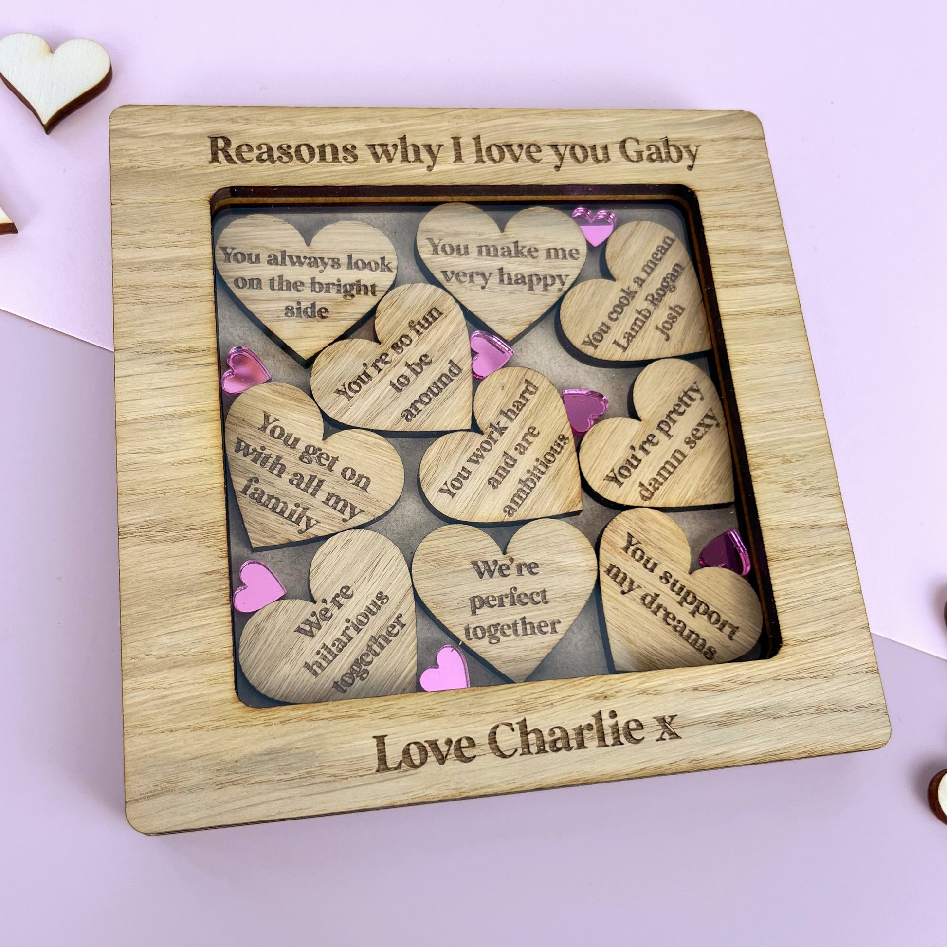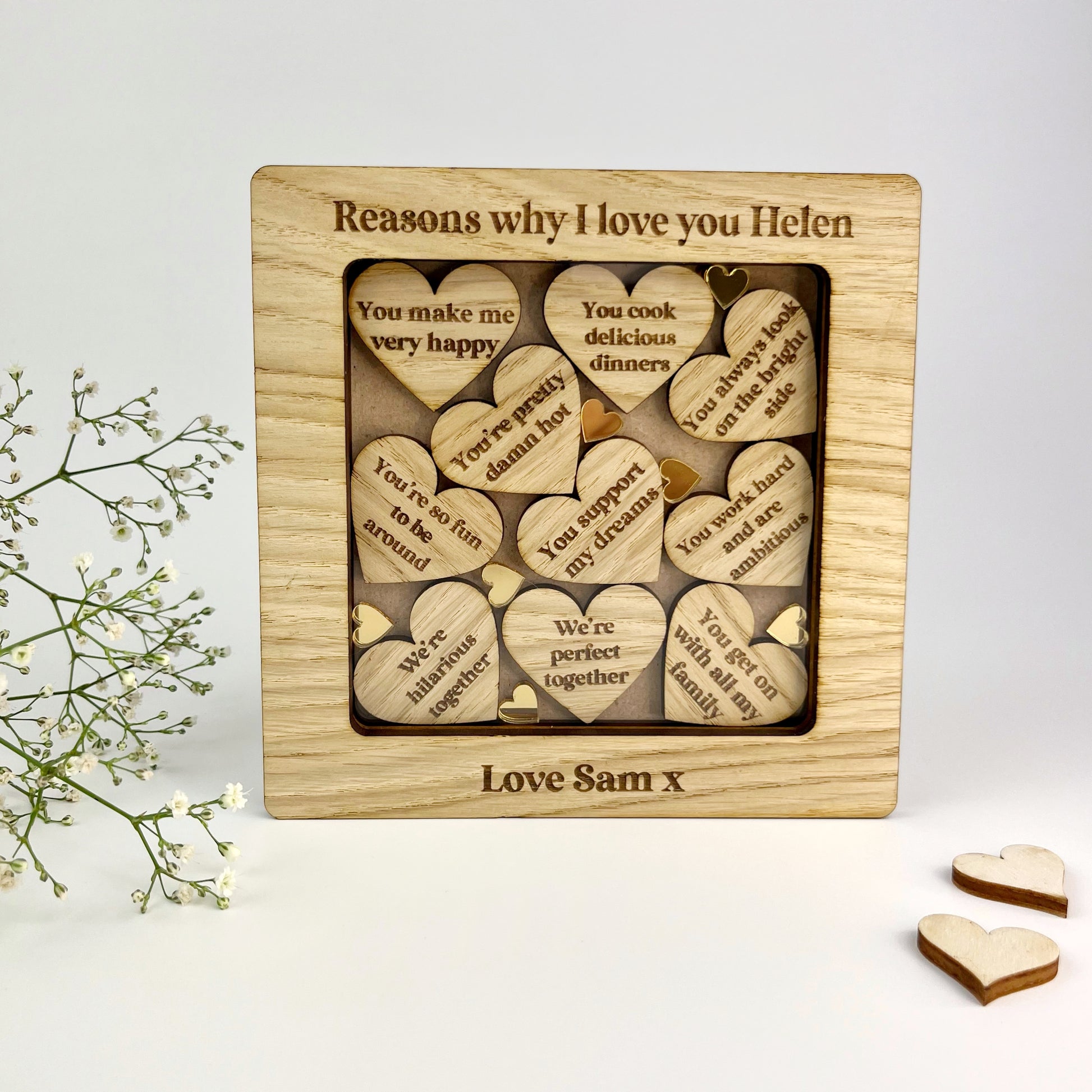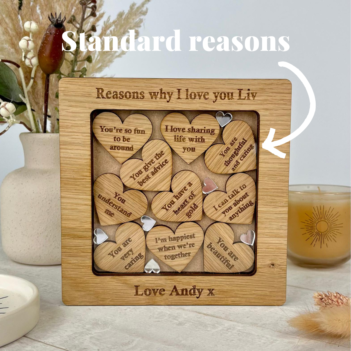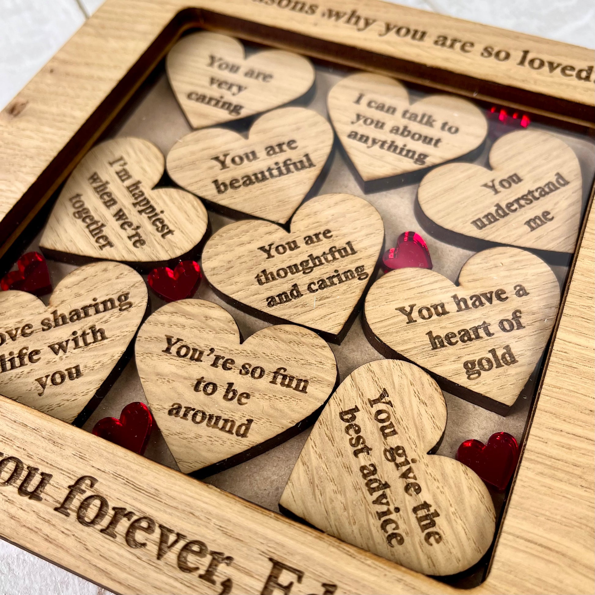 Your own words are engraved on to the top and bottom of this free-standing frame. You can choose a frame containing our pre-filled standard reasons, or customize each laser cut heart with your own personalised reasons!