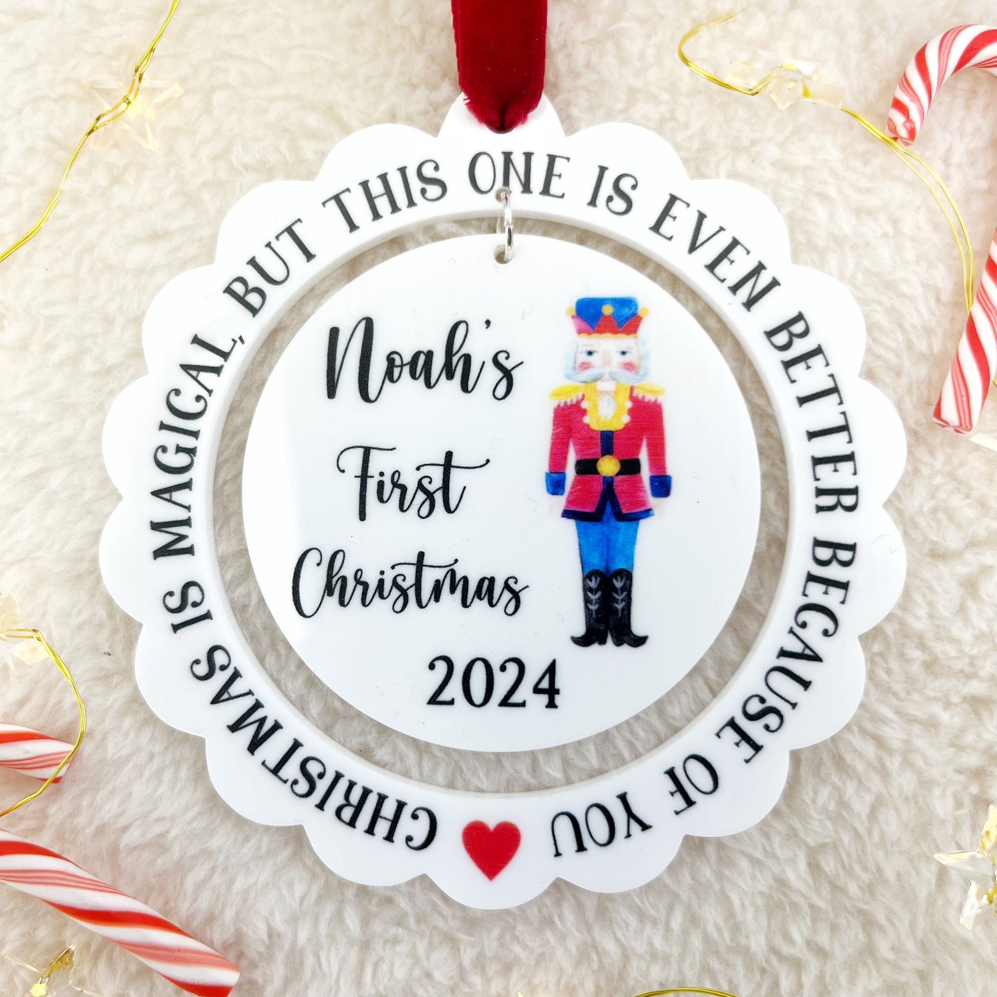 Celebrate a baby's first Christmas with this personalised tree ornament, a precious keepsake that can be treasured and hung upon the tree year after year.