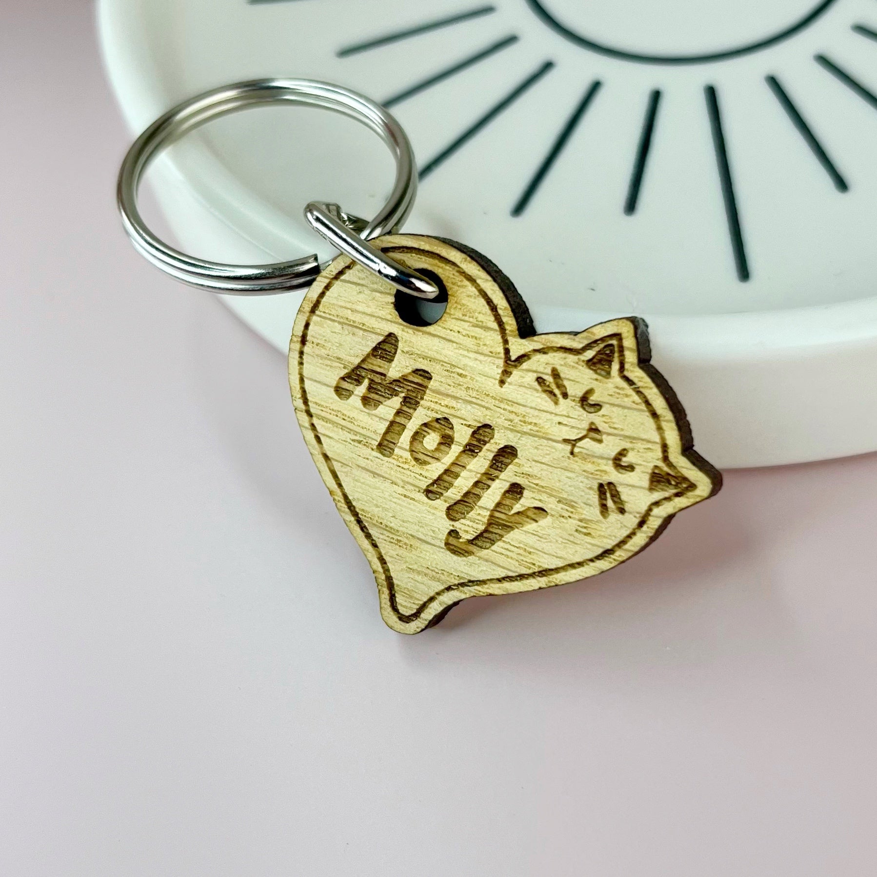 A little personalised wooden charm to honor our feline friends. Add the charm to your keys and have your cat with you where ever you go!