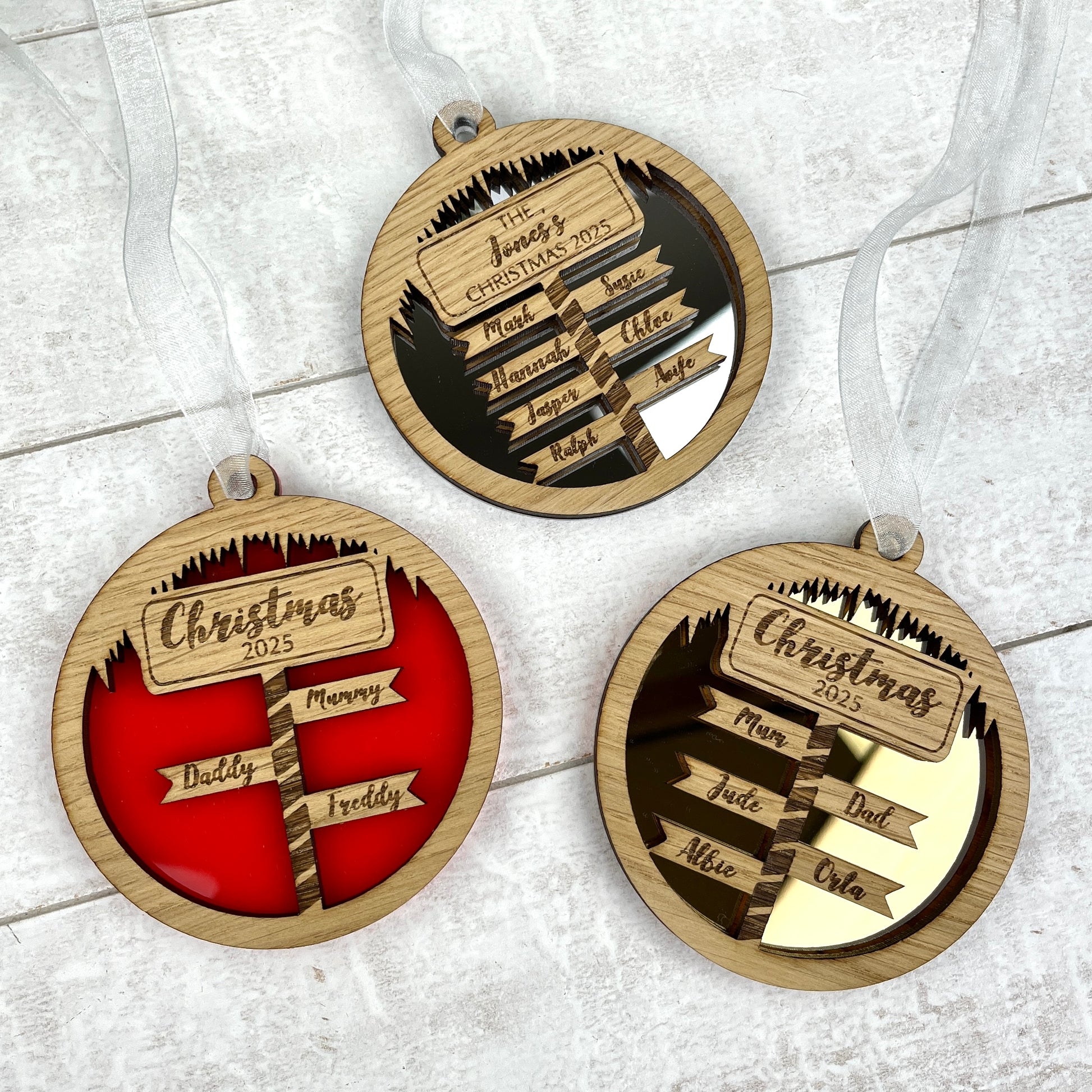 These Christmas tree decorations are made using coloured acrylic and oak veneered wood - you are able to choose from Silver or Gold Mirrored effect as well as a Red option.