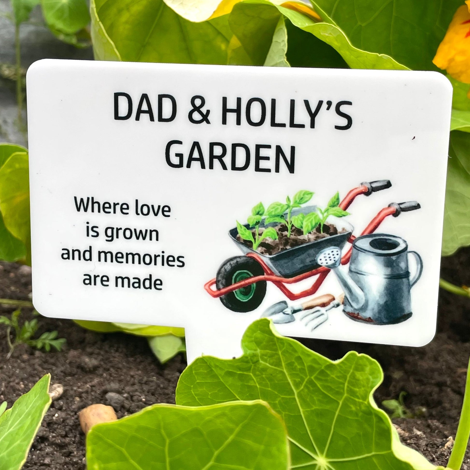 Personalised garden plaque with stake, printed with a watercolor illustration and customized by adding your own names and wording, available in a choice of sizes.