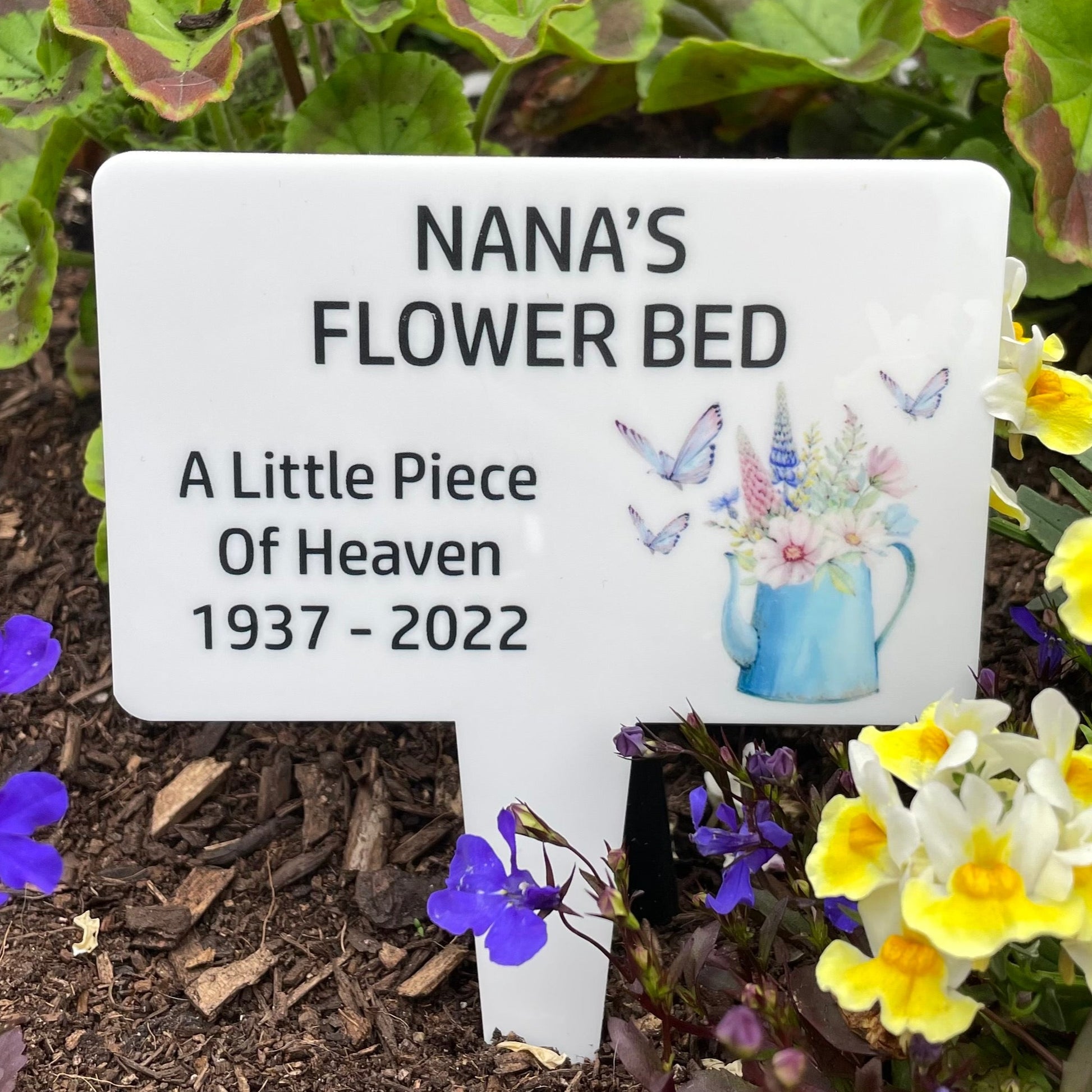 These garden plaques made from 3mm white Perspex acrylic and are available in the following different sizes:
