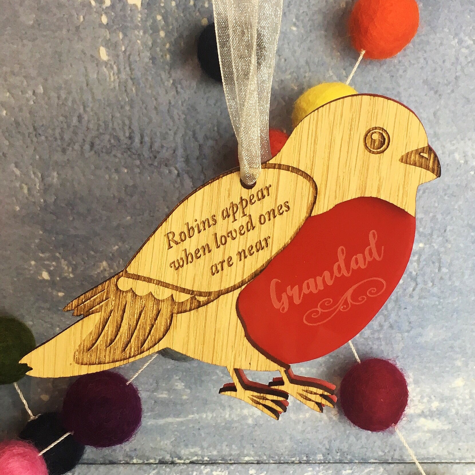 Made from red acrylic and oak wood, the item is engraved with the wording 'Robins appear when loved ones are near' as well as a personalised name of your choice on the robins chest.