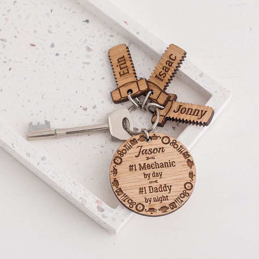 Personalised Mechanic Wooden Keyring & Charm Set