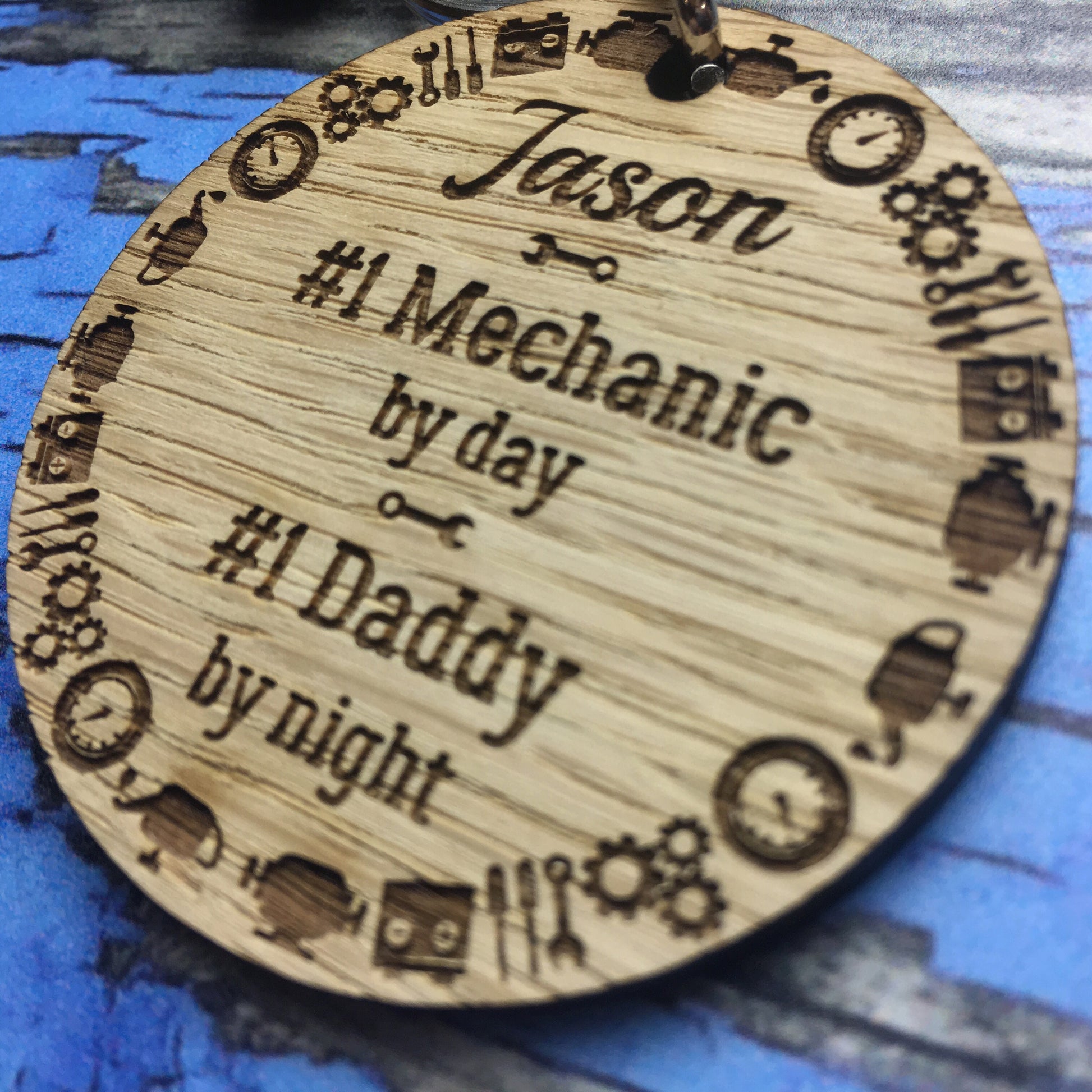 Designed and made in house, as always. This keyring has a very detailed border of tools and is personalised with your own text.