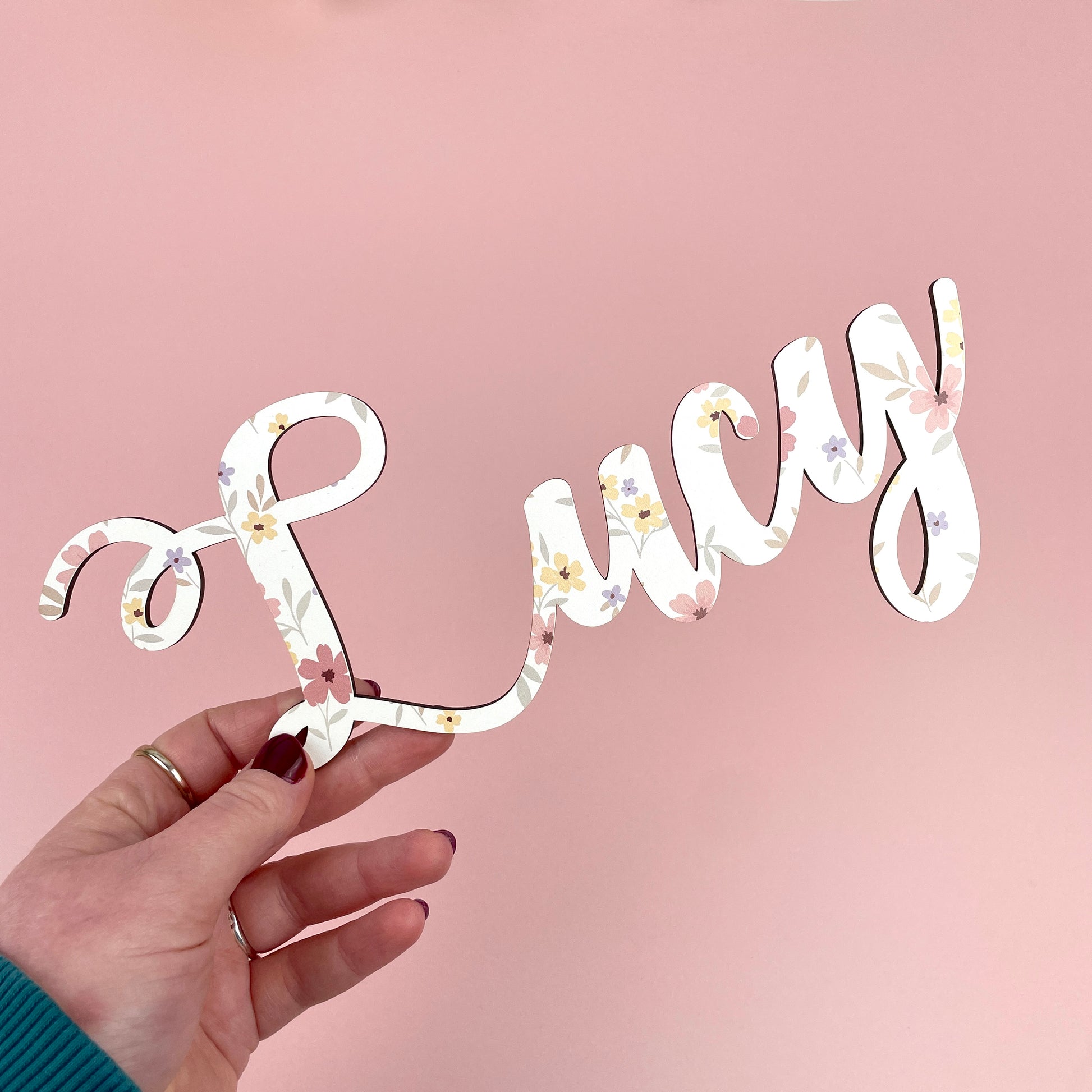 Each name sign is printed with high quality inks on 3mm MDF. MDF is known for being lightweight, which makes it the best choice for being mounted on a wall, door or a toy box. Each name is written out in a beautiful script style font, and printed on one side of the wood with a cute, coloured ditsy flower pattern, with hints of pink, yellow and green throughout the design.