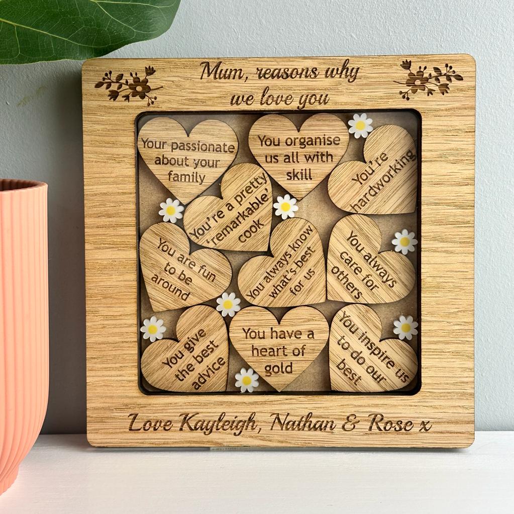 10 individual reasons are fitted within this oak frame. Personalised with your own wording along the top and lower part of the outer frame.