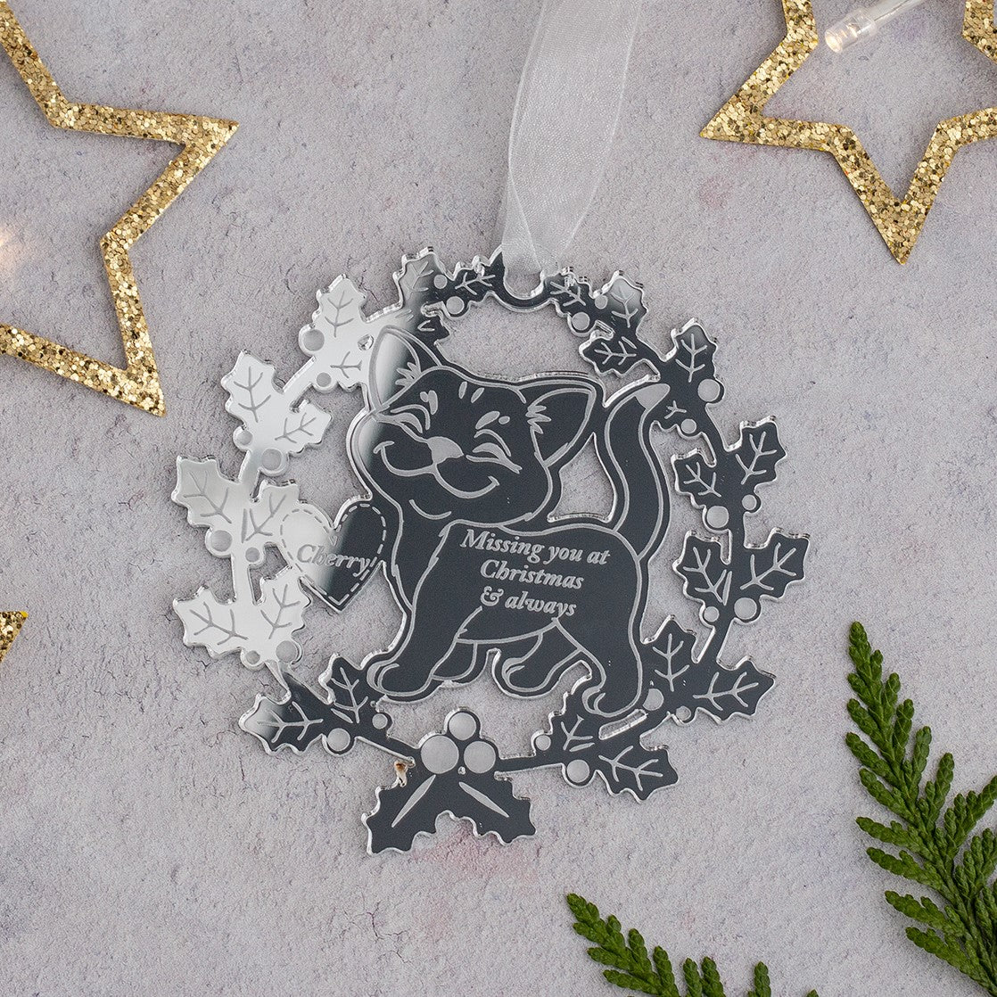 Silver Mirrored Acrylic Wreath Tree Decoration - Cat
