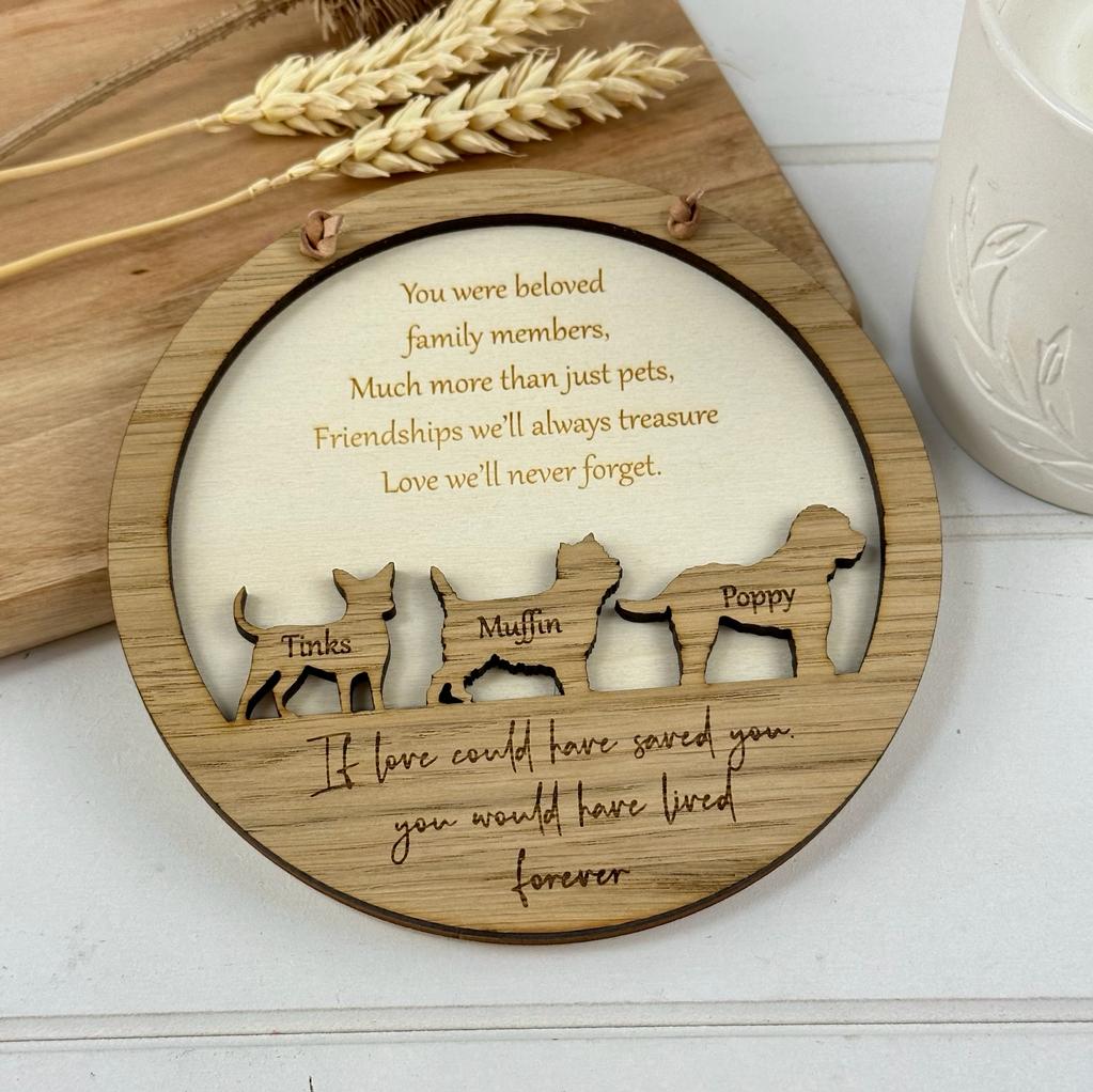 Have up to three different dogs added to the wooden memorial decoration, the name of each will be laser engraved on to the silhouette. The wording below the animals is also customized, add your own quote or message here.